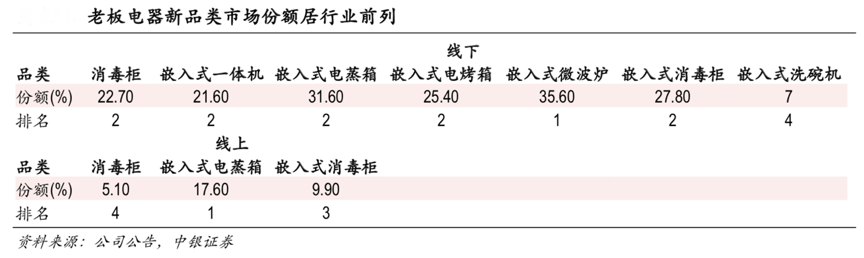 經典案例:根據公司公告、中銀證券等綜合資訊表明,2015年老板電器推出下翻嵌入式洗碗機,定義廚房高端生活美學; 2019 年推出臺嵌兩用洗碗機,解決安裝改造問題,持續引領行業發展。據老板電器2019年年報披露,老板嵌入式一體機、嵌入式電蒸箱、嵌入式電烤箱、嵌入式洗碗機市場份額分別為 21.6%(市場第 2)、31.6%(市場第 2)、25.4%(市場第 2)、7.0%(市場第 4)。