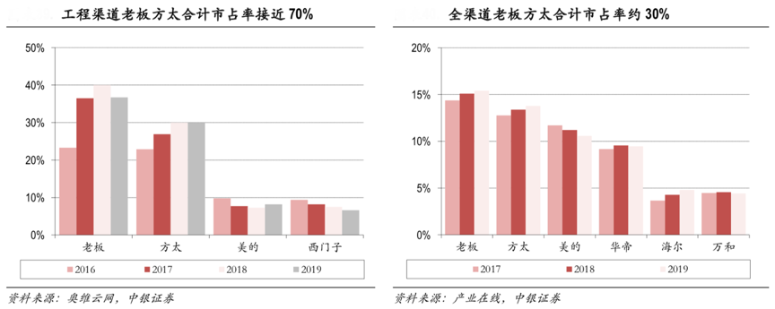 經典案例:根據奧維云網、中銀證券、產業在線等綜合資訊表明,家電渠道由 C 端主導正向“B端化”推進,以工程渠道為例,精裝修市場中品牌集中度相對較高,老板、方太市占率合計約70%,高于兩者全渠道合計市占率30%,全渠道及工程渠道的客戶價值日益明顯。