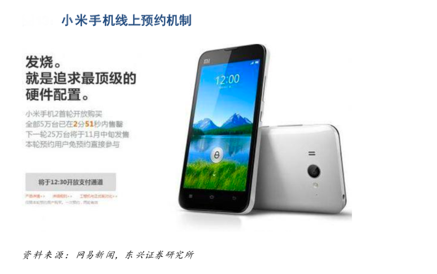 經(jīng)典案例:根據(jù)網(wǎng)易新聞、東興證券研究所等綜合資訊表明,在當(dāng)年 MIUI 論壇聚攏著大批量的“米粉”也就是公司所定義的“發(fā)燒友”,通過每周的版本發(fā)布,小米與米粉的互動非常頻繁。同時當(dāng)年的雷軍在微博上頻頻亮相,引起了極大的關(guān)注,建立了消費(fèi)者的購買欲望;在產(chǎn)品發(fā)售后小米采用預(yù)訂購機(jī)的方式銷售。