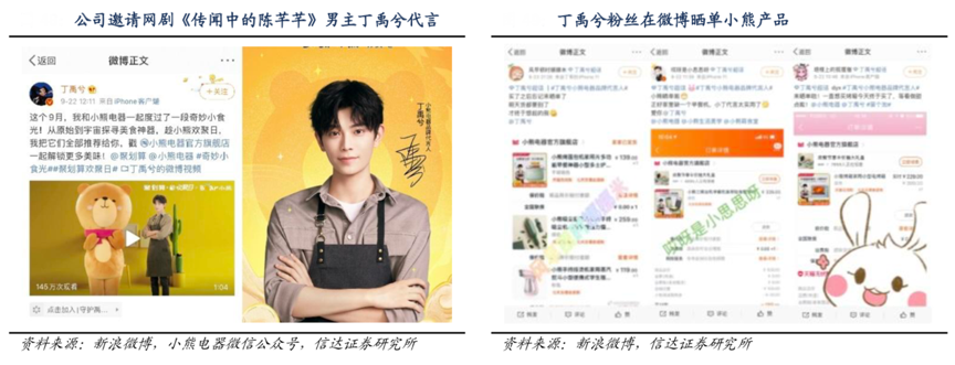 經(jīng)典案例:根據(jù)新浪微博、小熊電品微信公眾號(hào)、信達(dá)證券研究所等綜合資訊表明,小熊電器邀請(qǐng)新生代流量偶像擔(dān)任品牌代言人,緊抓住核心消費(fèi)客群。2020年9月份,其邀請(qǐng)網(wǎng)劇《傳聞中的陳芊芊》男主角丁禹兮擔(dān)任品牌代言人,取得了良好的品牌宣傳 效果,在社群媒體上經(jīng)常可見丁禹兮粉絲曬單公司的小家電產(chǎn)品,而且以女性居多。