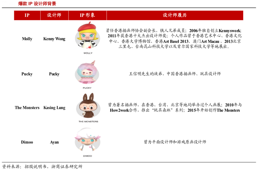 經典案例:根據泡泡瑪特招股說明書、浙商證券研究所等綜合資訊表明,其為了強化簽約藝術家設計動力,通過利益綁定增強簽約藝術家設計動力,比如,藝術家收入直接與對應 IP 銷售額掛鉤,且 2019 年 Molly 設計師王信明持有公司 1.4%股份;Molly 在 2017-2020H1 分別推出了 7 個、6 個、5 個、3 個新系 列,Pucky 在 2018-2020H1 分別推出了 3 個、6 個、3 個新系列。
