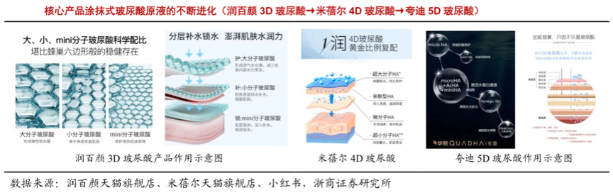 經典案例:華熙生物的核心產品——“玻尿酸次拋原液”產品正持續(xù)迭代,以 2018 年推出的高端品牌夸迪的5D玻尿酸為例,其產品包含 Hyacross、Hymagic-5D、microHA、miniHA、AcHA 五大玻尿酸分子,能夠分別作用于皮膚角質層、透明層、有棘層、顆粒層、基底層, 起到深層補水、強力鎖水作用。