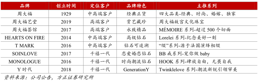 經典案例:根據公司公告、方正證券研究所等綜合資訊表明,周大福近年來積極推進多品牌發(fā)展策略,周大福主品牌與周大福藝堂,周大福薈館和 周大福鐘表等關聯品牌,以及HEARTS ON FIRE(HOF)、T MARK、SOINLOVE 與 MONOLOGUE 等其他品牌組成集團“多品牌”發(fā)展策略,覆蓋了中高端多類客戶,品牌特色多樣,主推系列鮮明。
