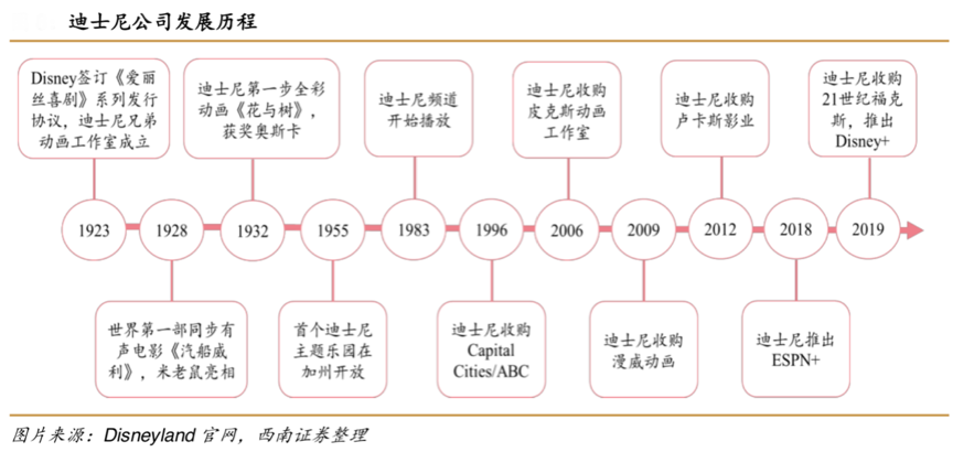 經典案例:根據Disneyland官網、西南證券整理等綜合資訊表明,迪斯尼公司經營多年發(fā)展,其擁有強大的“品牌IP經營模式”。 2009 年收購漫威,2012 年收購盧卡斯, 2019 年收購 21 世紀福克斯,手握 Hotstar、HULU 控制權,Disney+和 ESPN+所有權,通過獨特生態(tài)閉環(huán)搭建流媒體平臺,利用優(yōu)質的品牌IP進軍流媒體市場。