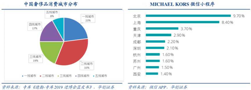 “區域化差別”是奢侈品品牌經營的常態,多區域聯動及分區域推進日益成為奢侈品品牌營銷策劃的“標配”,一二線引領、三四線跟進等成為奢侈品產品營銷策劃推廣的“不二之選”。根據寺庫、微信APP、華創證券等綜合資訊表明,2018年 9 月至 2019 年 9 月,全國奢侈品消費頻次排名前 30 個城市中有 27 個城市為三線及以下城市;復購頻次排名前30 的城市中有 29 個為三線及以下城市;購買三單以上人數比例前三十的城市全部為低線城市。
