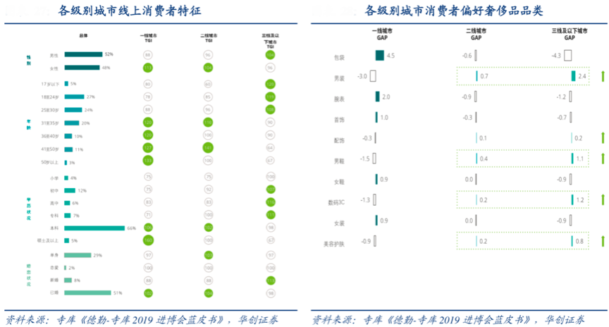 同時,各區域的“品類滲透”也有所不同,一二線城市用戶強化奢侈身份彰顯及品質認同,低線城市則強調個性化、高端時尚消費。根據寺庫、華創證券等綜合資訊表明,在線上消費者個人身份特征方面,低線城市奢 侈品線上消費者多為 30 歲以下的年輕男士,學歷相對較低,多處在新婚及戀愛狀態。而一二線城市奢侈品線上消費者多為 30 歲以上高學歷的已婚人士。在購買奢侈品品類方面,低線城市消費者花在男裝、男鞋、數碼 3C、美容護膚產品上的錢較多。而一二線城市奢侈品線上消費者明顯更青睞包袋、腕表、首飾等傳統奢侈品。