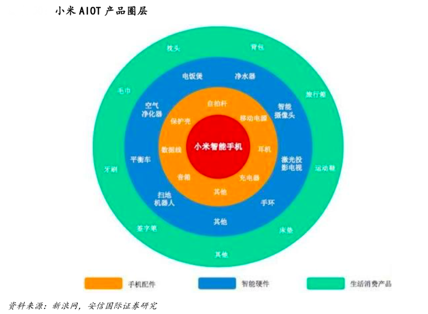 經典案例:根據公司網站、安信國際證券研究等綜合資訊表明,小米已經基本完成“全生態鏈布局”,其公司的主營業務包括智能手機、IoT 與生活消費產品、互聯網服務。在智能手機領域其分出了小米與紅米兩大主品牌以及其他子品牌,其中小米致力于高端市場,而紅米則主攻極致性價比;在 IOT 產品領域,其通過智能電視、可穿戴設備等在智能生活領域扮演控制中樞角色從而連通公司產業鏈其他的產品,進而構建智能生活未來;在互聯網服務方向,其廣告服務以及線上游戲以及小米金融的金融服務等增值服務是其收入的主要構成部分。