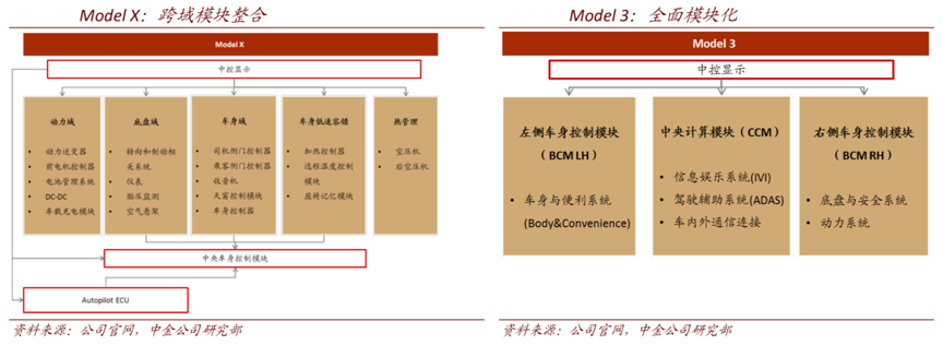 經典案例:根據公司官網、中金公司研究部等綜合資訊表明,特斯拉以軟件定義汽車,突破性模塊整合。Model X通過中 央車身控制系統對動力域、底盤域、車身域等進行跨域模塊整合,Model 3 則全面模塊化,分為左側車身控制模塊、中央計算模塊和右側車身控制模塊,更加有效地節省算力冗余,也更便于 OTA 升級。