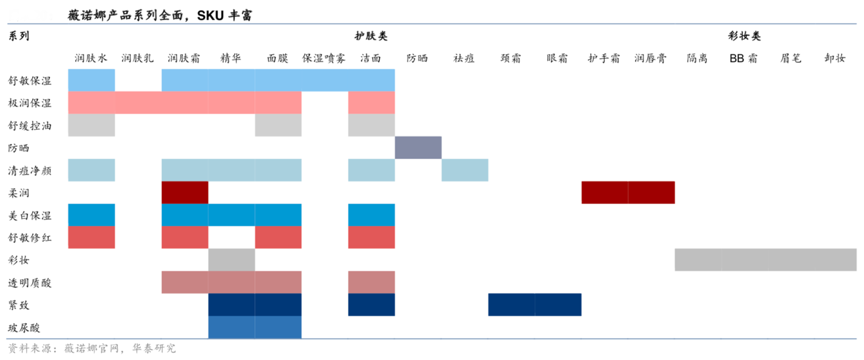 經典案例:根據薇諾娜官網、華泰研究等綜合資訊表明,2005年6月貝泰妮聯合昆明醫科大學第一附屬醫院皮膚科、中國科學院昆明植物研究所,通過醫、產、學、研結合, 從云南6000多種植物中,選出青刺果、馬齒莧、滇重樓、滇山茶作為產品的四大核心成分,并進行12000次以上的肌膚實測驗證,2008 年薇諾娜首次于第四屆中國皮膚科醫師年會上亮相。基于舒敏藥理理念, 旗下產品涵蓋舒敏保濕、舒緩控油、透白、極潤、緊致,防曬等 12 個系列,69 種單品。