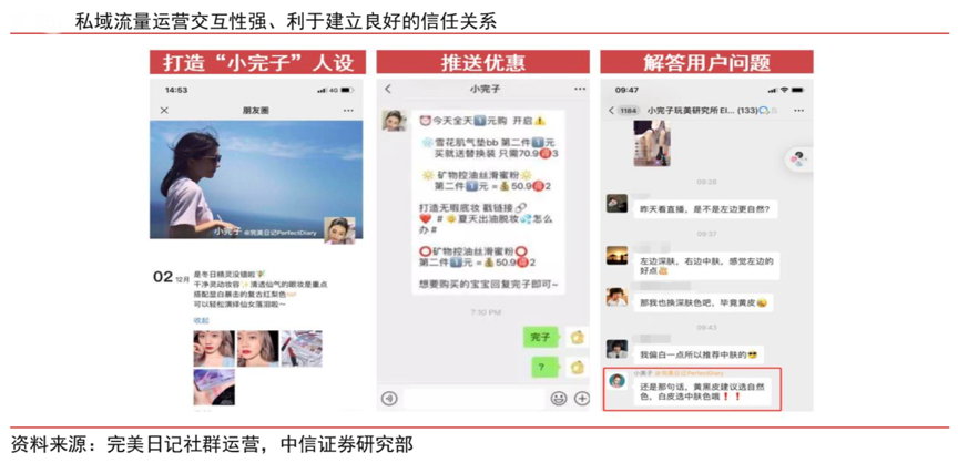 經(jīng)典案例:根據(jù)完美日記社群運營、中信證券研究部等綜合資訊表明,完美日記通過打造導購“小完子”的精致少女人設,不定期向用戶推送商品優(yōu)惠、解答用戶問題,有效拉近了與用戶的距離。同時品牌能夠通過微信群、個人微信等載體,實現(xiàn)與用戶的雙向溝通,通過發(fā)布用戶調(diào)研等方式洞察消費者的真實需求。