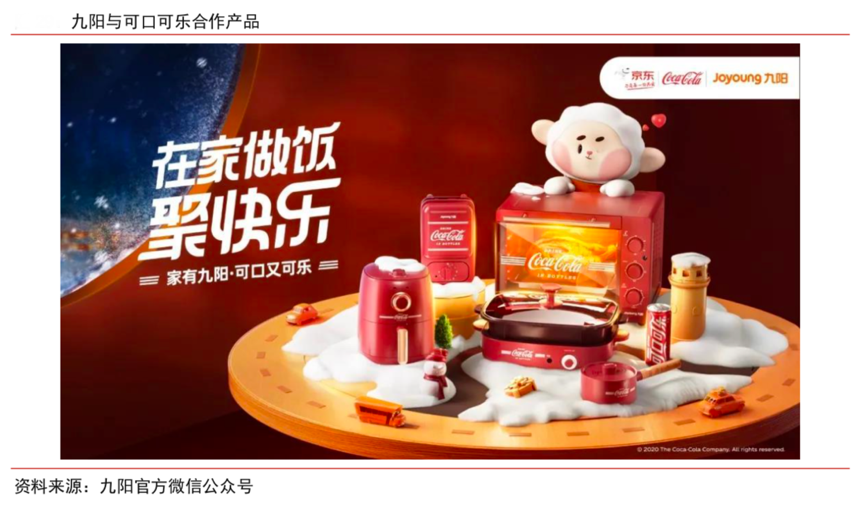 經典案例:根據九陽官方微信公眾號、中信證券研究部等綜合資訊表明,九陽積極學習小熊、摩飛等年輕化戰(zhàn)略,捕捉當代年輕人的興趣愛好與生活習慣。 截止 2021 年 1 月,其累計已經與 Line Friends、Hello Kitty、皮卡丘、喜茶、哆啦 A 夢和可口可樂等實現合作,積極推出各類聯名產品,吸引年輕消費群體。在產品功能上,其通過覆蓋養(yǎng)生、便攜和一人食等多維度需求,推出了養(yǎng)生壺、果汁杯、鍋灶分離火鍋、小型烤箱等長尾產品。