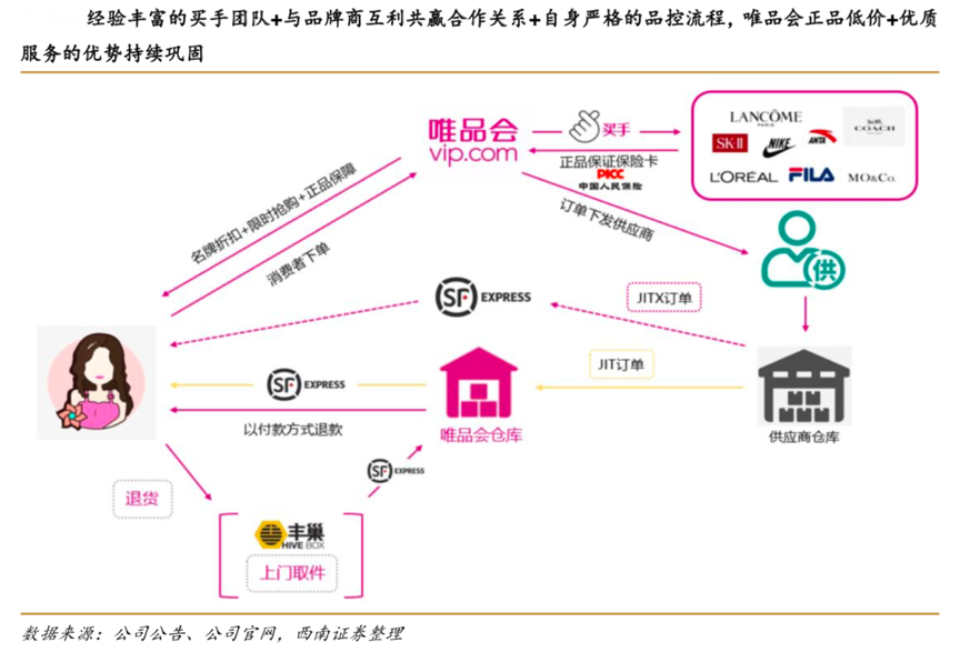 經典案例:根據公司公告、公司官網、西南證券等綜合資訊表明,唯品會擁有超過千人的專業買手團隊。買手們憑借豐富的銷售經驗,考慮歷史數據、流行趨勢、季節和顧客反饋,收集、分析、使用顧客行為交易數據,通過顧客關系管理 和智能商務系統,挑選符合潮流和消費者欣賞角度的品牌好貨。同時也向品牌商提供部分信 息,提前跟品牌商談判價格拿貨。并通過“品牌折扣+限時搶購+正品保障”的商業模式進行營銷,激發消費動力,保證庫存清理能力。