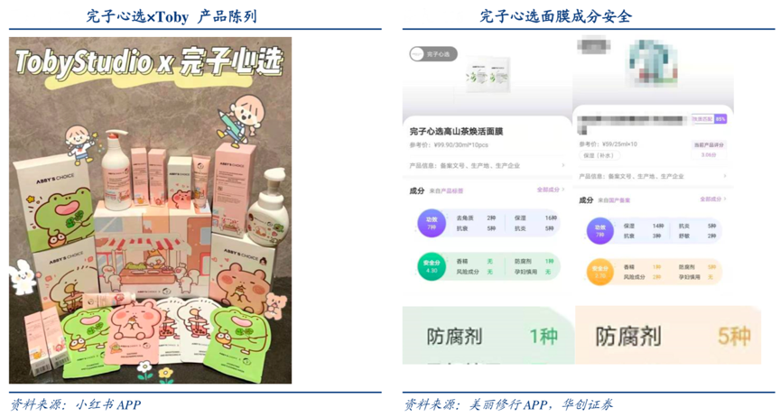 經典案例:根據小紅書APP、美麗修行APP、華創證券等綜合資訊表明,完子心選主打溫和護膚品,以護膚品為抓手,價格控制在 50-150 元內。完子心選與 Toby、 魔卡少女櫻聯名,因其精致可愛的產品包裝、顏色受到廣泛關注。在第三方 APP 測評中,以完子高山茶煥活面膜為例,不含香精與風險成分,僅含 1 種防腐劑,安全分 4.3 分。