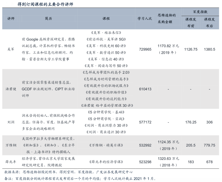 經(jīng)典案例:根據(jù)思維造物招股說明書、得到官網(wǎng)、百度指數(shù)、廣發(fā)證券發(fā)展研究中心等綜合資訊表明,得到公司通過專業(yè)化的課程制作和品控流程,流程式打造了多IP的優(yōu)質(zhì)課程矩陣。截至2021年1月11日,得到上總學(xué)習(xí)人次超過50萬的講師已有吳軍、湯君健、劉潤、脫不花、萬維鋼、薛兆豐、 戴愫、張遇升,這些商業(yè)領(lǐng)域?qū)<医柚玫狡脚_(tái)快速擴(kuò)大知名度和影響力。