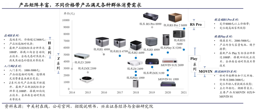 經典案例:根據中關村在線、公司官網、招股說明書、興業證券經濟與金融研究院等綜合資訊表明,極米專注智能微投品類,分為五大系列: RS Pro 系列、H 系列、Z 系列、便攜 Play 系列和子品牌 MOVIN,分別對應超高 端到入門級不同價格帶和消費群體,其中入門級 Z 系列和高端 H 系列貢獻為支柱, 2020 年收入占比分別為30%/40%。極米多款明星單品行業銷量領先,根據京東平臺數據,2019 年極米共有 5 款產品位列國內智投銷量Top10,其中極米 Z6、H2 登頂前兩名。