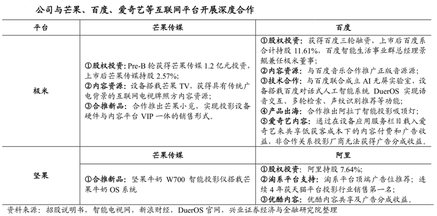經典案例:根據中關村在線、智能電視網、新浪財經、DuerOs官網、興業證券經濟與金融研究院等綜合資訊表明,極米公司背靠百度,以股權融資、內容共享、技術合作以及產品出海等方式與百度系和芒果 TV 等內容平臺展開深度合作,收效明顯。極米設備搭載百度對話式人工智能 DuerOS 系統提高智能性,打造行業領先的智能語音遙控智投設備。