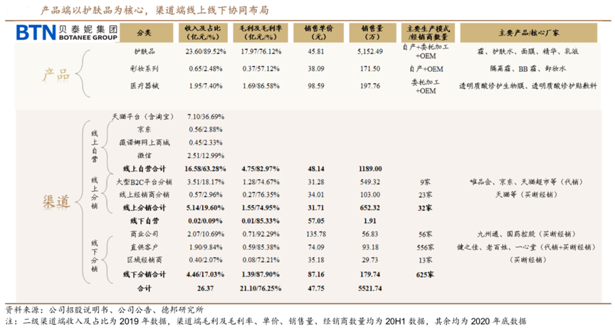 經典案例:根據公司招股說明書、公司公告、德邦研究所等綜合資訊表明,貝泰妮公司于2011 年開設天貓旗艦店,2012 年成立電商事業部以拓展線上渠道,其始終把握線上流量紅利,2013 年開設京東 旗艦店,抓住直播及社交電商浪潮,布局小紅書、抖音等平臺。2017年貝泰妮在微信平臺搭建平臺,在行業中率先實現了線上和線下的相互滲透,通過派駐在終端網點的 BA 與客戶進行溝通,后引導客戶加入會員,實現了下拿下帶動線上的協同發展。