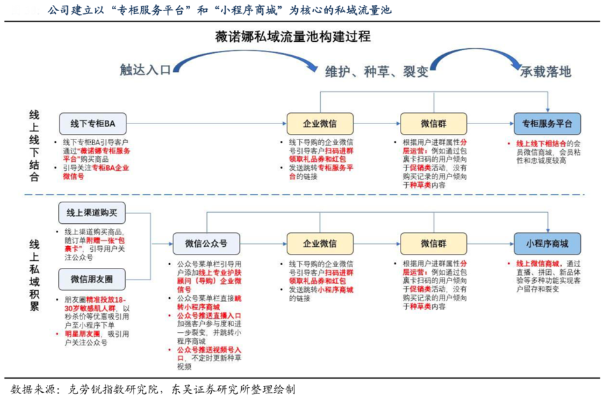 經典案例:根據克勞銳指數研究院、東吳證券研究所等綜合資訊表明,薇諾娜在完成消費者的初步觸達之后,其可通過 BA 的企業微信、微信群、視頻號、直 播入口等方式進行客戶的維護、種草和裂變。具體來看,線下專柜的消費者和線上消費者在完成關注或購買后,分別通過被引導加入線下和線上的 BA 企業微信號。在此基礎上,BA 通過其企業微信號向消費者推送微信群二維碼,以福利或紅包的形式吸引消費者加入分層精準運營的微信群,以此實現公域流量向私域流量的轉化,并完成客戶的維護、促進客戶復購。