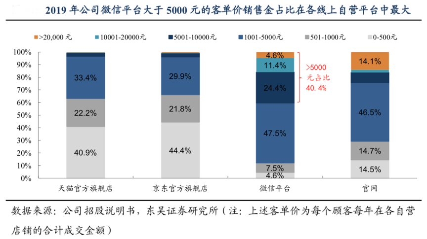 經典案例:根據公司招股說明書、東吳證券研究所等綜合資訊表明,薇諾娜在其各自營電商渠道中,微信平臺消費的客單價最高,2019 年微信平臺客單價大于 1000 元/大于 5000 元的銷售金額占比達到 87.9%/40.4%。專柜服務平臺客戶主要集中于 0-10000 元的客單價區間,主要系客戶具有線下實體店使用經驗,對產品屬性較為熟悉,傾向于組合購買,且經過 BA 的推廣和維護復購率較高。
