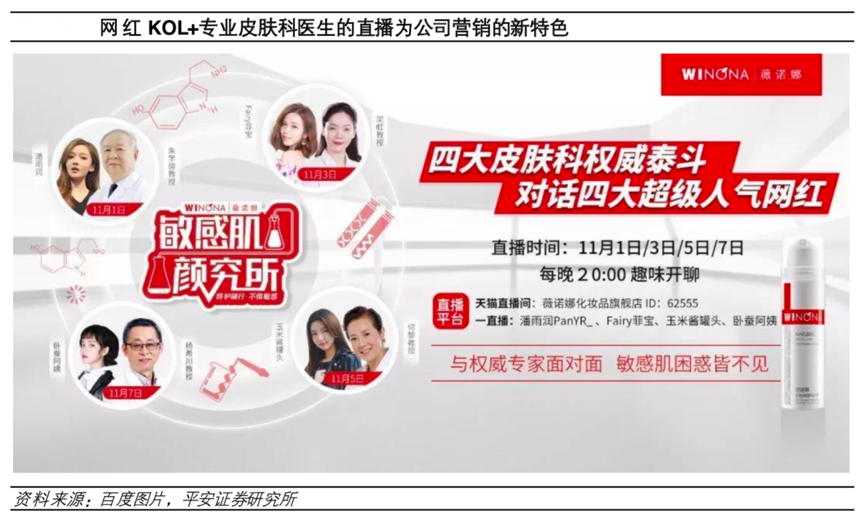 經(jīng)典案例:根據(jù)百度圖片、平安證券研究所等綜合資訊表明,薇諾娜2019年起,直播帶貨由于受眾廣泛、互動(dòng)性強(qiáng)、轉(zhuǎn)化率高等優(yōu)點(diǎn)而逐步成為化妝品行業(yè)標(biāo)配的營銷手段,同時(shí)其在主播選擇上可選取專業(yè)度和消費(fèi)者信任度更高的皮膚科專家,進(jìn)一步增強(qiáng)直播間的說服力。目前,薇諾娜公司已形成每月數(shù)次的醫(yī)生直播活動(dòng),并在雙十一等重大電商節(jié)中連續(xù)開展 KOL+醫(yī)生的直播活動(dòng),較競品進(jìn)一步突出專 業(yè)、可靠的概念。