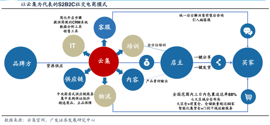 經(jīng)典案例:根據(jù)云集官網(wǎng)、廣發(fā)證券發(fā)展研究中心等綜合資訊表明,云集早前S2B2C社交電商模式核心在于平臺(S)作為核心整合供應(yīng)鏈并賦能店主 (B),構(gòu)建品牌方(產(chǎn)品)和買家(C)的新鏈路。其中云集平臺集成標(biāo)準(zhǔn)化中后臺供應(yīng)鏈服務(wù),店主則僅負(fù)責(zé)前端分享引流,形成熟人背書的社交銷售“場”。