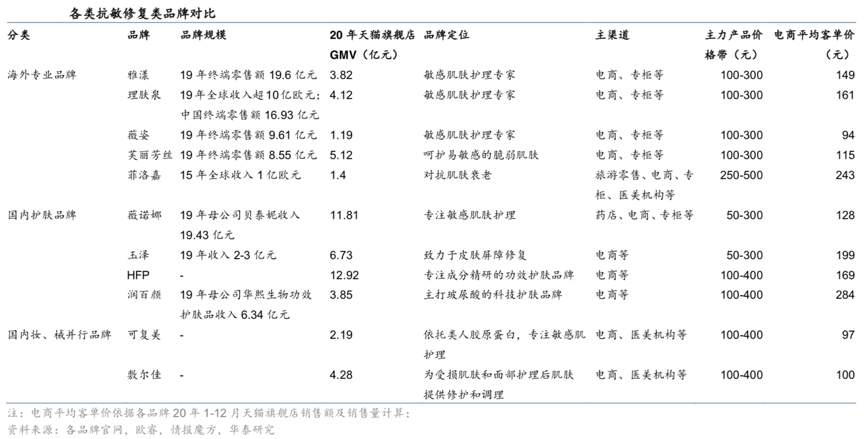 經(jīng)典案例:根據(jù)各品牌官網(wǎng)、歐睿、情報(bào)魔方、華泰研究等綜合資訊表明,市場(chǎng)上布局抗敏修復(fù)類(lèi)品牌主要有三大陣營(yíng),其中玉澤、薇諾娜、果本等國(guó)內(nèi)化妝品牌更契合國(guó)人護(hù)膚需求,但不同品牌發(fā)展路徑差異較大,定位醫(yī)研共創(chuàng)、專(zhuān)業(yè)性較強(qiáng),且能夠及時(shí)把握電商發(fā)展紅利,依托線上高速增長(zhǎng)的品牌較為稀缺。同時(shí)依托醫(yī)用敷料類(lèi)械字號(hào)產(chǎn)品起家、妝字號(hào)協(xié)同發(fā)展的創(chuàng)爾美、敷爾佳等在醫(yī)美機(jī)構(gòu)、診所等 B 端專(zhuān)業(yè)渠道可能有一定積累,C 端消費(fèi)者認(rèn)知仍正在逐漸培育。