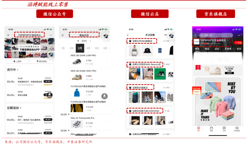經典案例:根據公司微信公眾號、京東旗艦店、中泰證券研究所等綜合資訊表明,滔搏公司通過微信小程序為優質大店設立線上云店,同時為大部分門店開通移動收銀功能,打破地域限制,使客戶在店內、離店狀態都可以隨心購買,更好地激活私域流量。