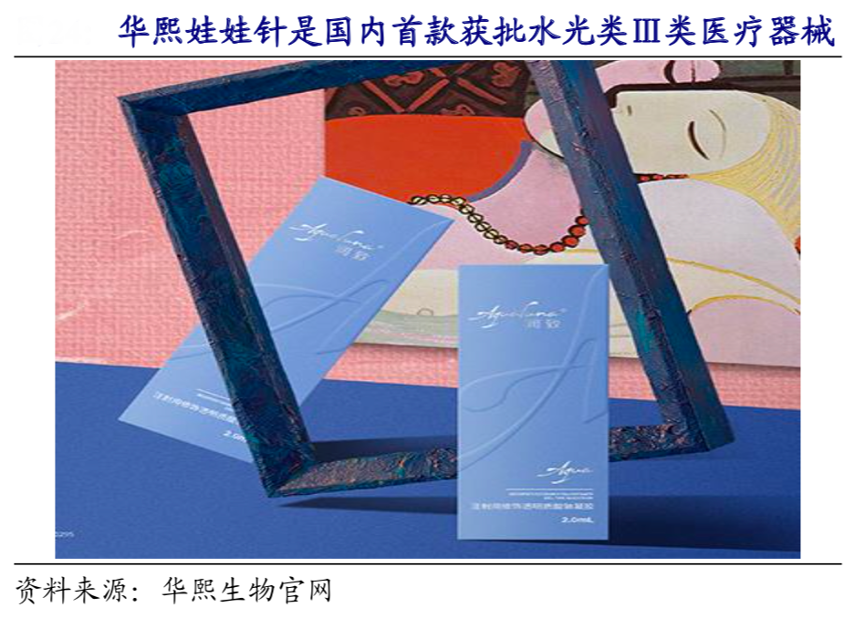 經典案例:根據華熙生物官網、開源證券研究所等綜合資訊表明,華熙生物在 2020 年中推出了 Aqua 娃娃針,定位高端,技術上采用 HEC 高效交聯技術,可以有效幫助肌膚實現緊致;成分上添加利多卡因,可以實現陣痛抗炎的作用,添加了 18 種氨基酸促進膠原蛋白再生,提高肌膚彈性;功效上看,主打補水+緊致+平紋三效合一。