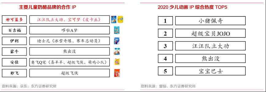 經典案例:根據京東、雷報、東方證券研究所等綜合資訊表明,妙可藍多兒童奶酪產品自 2018 年起與知名少兒動畫 IP“汪汪隊”深度合作,通過產品包 裝吸引目標人群,百吉福、伊利等品牌則分別攜手哆啦 A 夢、迪士尼等動畫 IP。雷報統計顯示,綜合優酷、愛奇藝、騰訊、芒果 TV 四大平臺數據來看,2020 年《汪汪隊立大功》在少兒動畫 IP 熱度中排名第三,在眾多奶酪品牌聯合動畫 IP 中脫穎而出。此外,2020年其與寶可夢合作推出金裝奶酪棒,定位目標人群父母進行“家庭化”營銷。