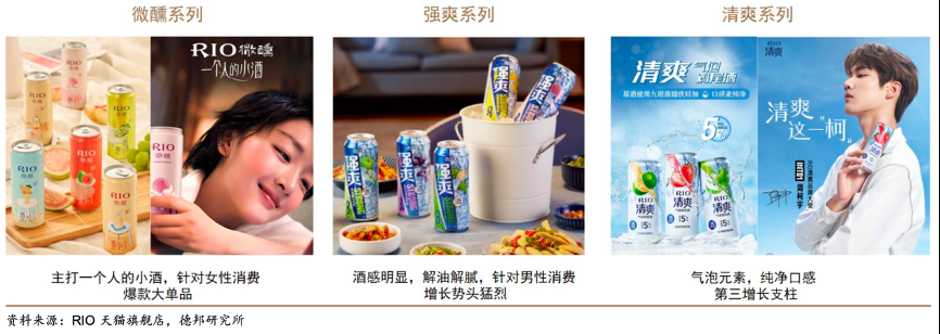 經典案例:根據RIO天貓旗艦店、德邦研究所等綜合資訊表明,2018年微醺系列升級,主打“一個人的小酒”場景定位,精準定位個人獨飲,關 注女性消費群體,加之消費場景的宣傳培育,微醺系列成為爆款大單品。2016 年公司針對男性消費群體推出強爽系列,酒精度提升到 8%vol,酒感更明顯,定位重油重辣餐飲消費。