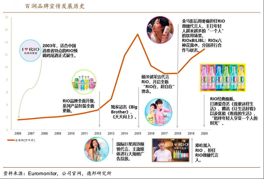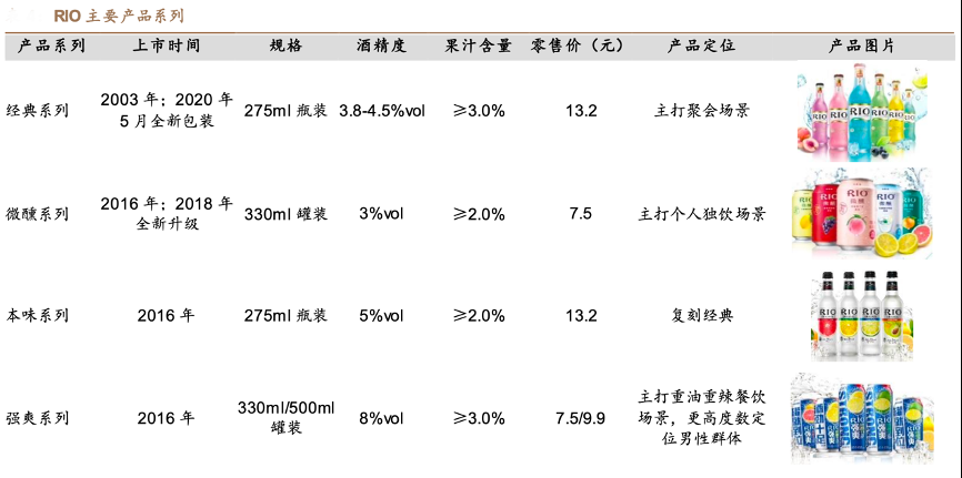 經(jīng)典案例:根據(jù)Euromonitor、公司官網(wǎng)、德邦研究所等綜合資訊表明,順應(yīng)行業(yè)發(fā)展, RIO 經(jīng) 典瓶于 2003 年上市,2010 年前市場處于早期培育階段,行業(yè)起步期主要消費場 景為夜場,2010 年后公司將品牌進(jìn)一步定位為“小姐妹聚會的青春小酒”,產(chǎn)品定位追逐時尚的年輕女性,消費場景也從夜場向餐飲延伸。2018年微醺大單品全面升級后,其在宣傳上定位更為精準(zhǔn),簽約當(dāng)紅明星鄧倫、周冬雨作為代言人,定位為“一個人的小酒”,將消費場景拓展到居家休閑場景,塑造了“有溫度”的品牌形象。