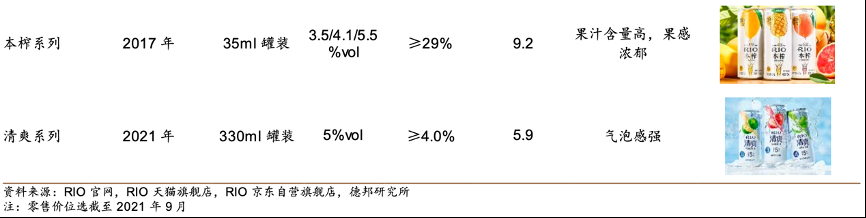 經(jīng)典案例:根據(jù)RIO官網(wǎng)、RIO天貓旗艦店、RIO京東自營旗艦店、德邦研究所等綜合資訊表明,當(dāng)前RIO公司預(yù)調(diào)酒已包括不同酒精度的微醺系列、經(jīng)典系列、清爽系列、強爽系列、夜獅系列、限定/聯(lián)名/定制系列等多個系列50多種口味,而當(dāng)前新銳品牌口味大多為個位數(shù),其在產(chǎn)品端已形成先發(fā)優(yōu)勢。