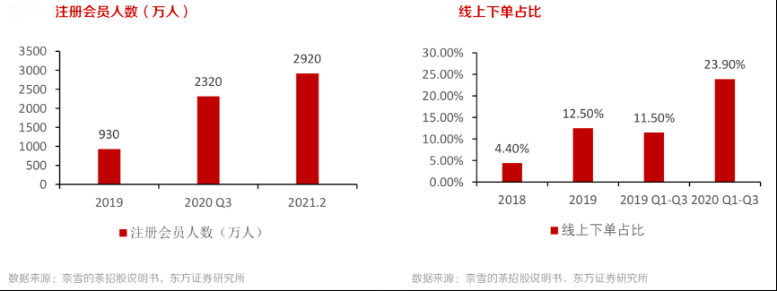 經典案例:根據奈雪的茶招股說明書、東方證券研究所等綜合資訊表明,奈雪的茶從2019年底的 930 萬名增長至2021 年 2 月的 2920 萬名,其中活躍會員人數從 2019 年底的 200 萬名增長至 2020 年底的 580 萬名,增長190%。線上下單占比也實現了大幅提升,從 2018 年的 4.4%提升至 2020 年的 23.9%。