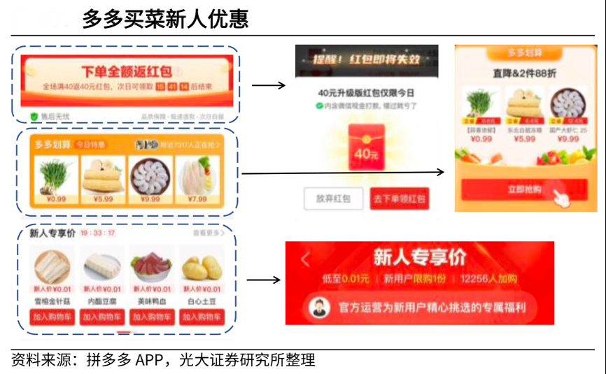 經(jīng)典案例:根據(jù)拼多多APP、光大證券研究所等綜合資訊表明,多多買菜新人客戶可以享有滿××減××紅包,并在消費者打算退出界面時以彈窗形式提醒用戶有未消費紅包/優(yōu)惠。同時多多買菜還設(shè)有限時秒殺、多多劃算、新人專享價等板塊,以“直降××元”、“秒殺標(biāo)示”、“已搶××”、“限購× ×件”等加強消費者的購買沖動。