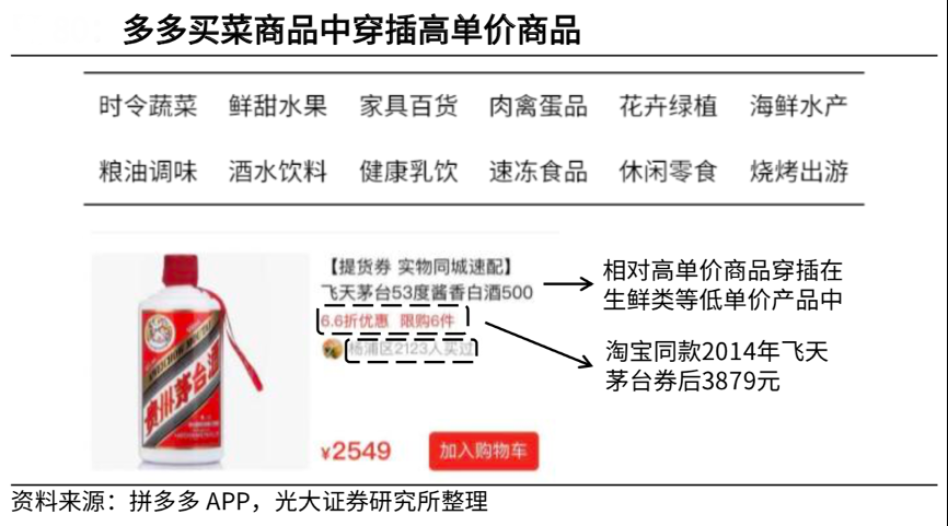經(jīng)典案例:根據(jù)拼多多APP、光大證券研究所等綜合資訊表明,拼多多利用多多買菜等高頻消費板塊帶動高單價消費,2020 年下半年拼多多上線多多買菜業(yè)務(wù),不僅覆蓋生鮮類農(nóng)產(chǎn)品,還覆蓋日用百貨酒水花卉等,含有客單價較高的酒水、鍋具、家具等品類,通過交叉銷售的方式提升客單價和單人消費金額。