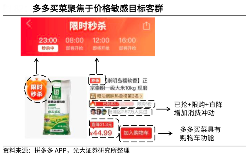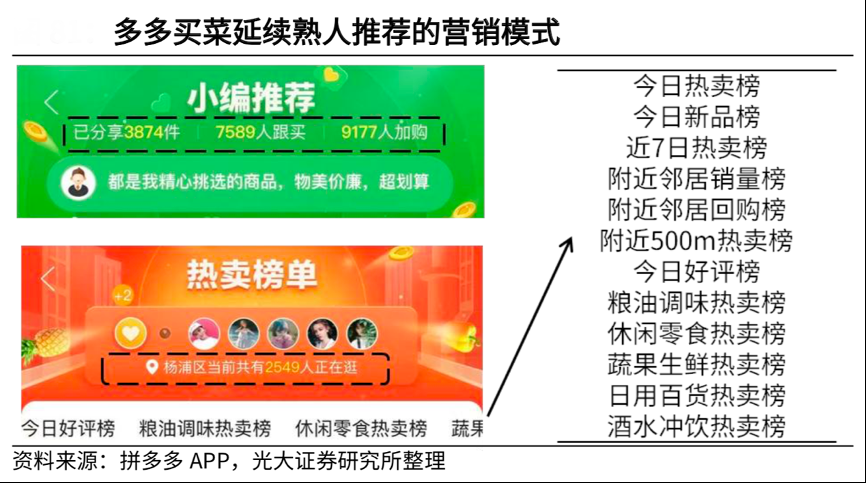 經(jīng)典案例:根據(jù)拼多多APP、光大證券研究所等綜合資訊表明,多多買菜延續(xù)熟人推薦的營(yíng)銷模式,設(shè)有小編推薦、熱賣榜單等板塊,其中熱賣榜單除了按產(chǎn)品分類外,還設(shè)有附近鄰居銷量榜、附近鄰居回購榜、附近 500m 熱賣榜等欄目。用戶參考鄰居購買記錄將降低某一社區(qū)周邊 SKU 數(shù),提高單 SKU 銷量,從而在一定程度上降低履約成本。