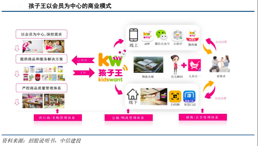 經典案例:根據招股說明書、中信建投等綜合資訊表明,“孩子王”是一家以數據驅動、基于用戶關系經營的創新型新家庭服務平臺。其以顧客需求為導向,在零售商業內開創了以會員為核心資產的“商品+服務+社交”的大店模式、育兒顧問式服務模式、重度會員制下的單客經濟模式。