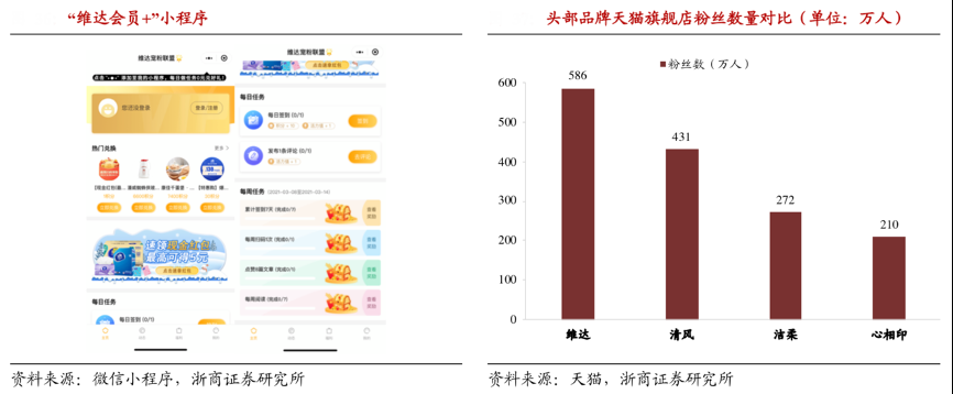 經(jīng)典案例:根據(jù)微信小程序、天貓、浙商證券研究所等綜合資訊表明,維達建立健全的會員機制吸引大量忠實粉絲,各大電商平臺均有針對粉絲的入會禮和積分激勵制度;2020年維達公司上線“維達會員+”小程序,以做任務兌換積分等形式加強了會員粘性。當前維達粉絲數(shù)量遠高于同行,以天貓旗艦店為例,維達、清風、潔柔、心相印官方旗艦店粉絲數(shù)量分別為 586、431、272、210 萬。