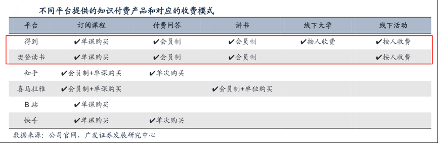 經典案例:根據公司官網、廣發證券發展研究中心等綜合資訊表明,目前主流的知識付費產品包括訂閱課程、講書、 付費問答、線下大學、線下活動等。從付費模式來看,輕度且標準化的講書產品以會員收費為主,付費問答采用會員收費或單次收費,訂閱課程以單課收費為主,服務更深度的線下活動和線下大學采用按人收費的模式。