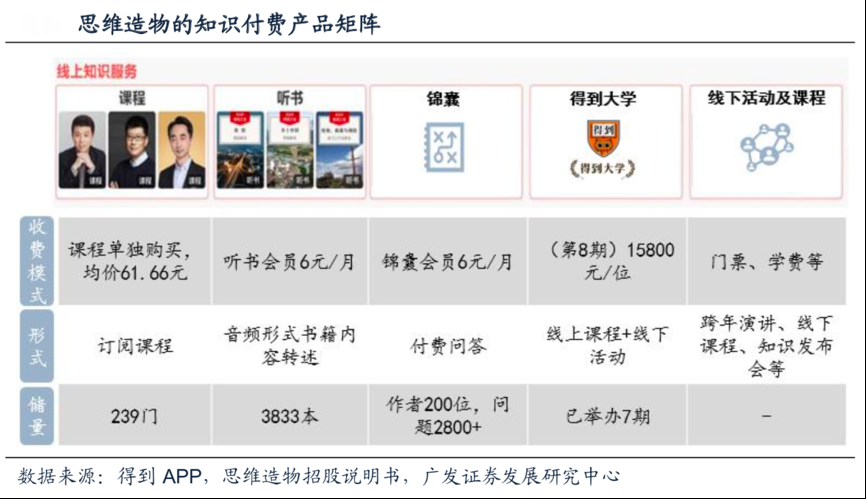 經典案例:根據得到APP、思維造物招股說明書、廣發證券發展研究中心等綜合資訊表明,思維造物提供的知識付費產品主要包括訂閱課程、講書、付費問答、得到大學、線下活動及課程這五種形式。訂閱課程的內容涉及應用技能類、商學類、科學類和人文類,用戶通過訂閱課程付費,單個課程的售價在19.9-365元之間,期數在5-394 講不等,每講時長一般在10-20分鐘。