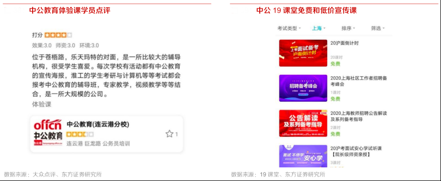經(jīng)典案例:根據(jù)大眾點(diǎn)評(píng)、東方證券研究所等綜合資訊表明,中公教育以免費(fèi)或低價(jià)宣傳課加強(qiáng)線下引流,其在線下開設(shè)在高校附近及中心城區(qū)的校區(qū)推出了數(shù)量較多的面授宣傳課,收費(fèi)宣傳課的價(jià)格從 9.9 元至 299 元不等,線上則通過官網(wǎng)、中公 19 課堂 APP 或通過第三方直播平臺(tái)(如騰訊課堂等),發(fā)布部分培訓(xùn)項(xiàng)目的試聽及限時(shí)錄播產(chǎn)品,或進(jìn)行不定期免費(fèi)直播授課或答疑,付費(fèi)低價(jià)課多為 1-19.9 元。