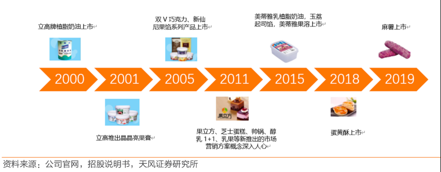 經典案例:根據公司官網、招股說明書、天風證券研究所等綜合資訊表明,2000年立高牌植脂奶油上市為立高在行業內占據一席之地,2001年立高推出晶晶亮果膏使得果膏蛋糕成為一個行業品類,之后雙V巧克力等產品逐漸上市。2018年,2019年立高又分別推出蛋黃酥和麻薯進一步擴寬了公司的業務。立高公司豐富的產品能充分滿足下游不同類型客戶的多產品、多規格的一站式采購消費需求,極大的提高了客戶的使用便利性。