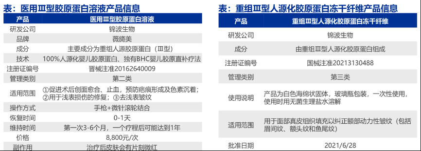 經(jīng)典案例:根據(jù)國家藥監(jiān)局、新氧、申萬宏源研究等綜合資訊表明,錦波生物“醫(yī)用III型膠原蛋白溶液”是旗下品牌薇旖美的全球首款100%人源化嬰兒膠 原產(chǎn)品,能直接補充人因年齡增長而流失的III型膠原蛋白,快速修復人皮膚中斷裂的 膠原蛋白和受損的細胞,促使細胞高效再生和增殖,讓肌膚變得飽滿、有彈性。