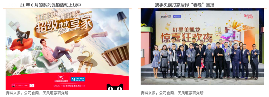 經(jīng)典案例:根據(jù)公司官網(wǎng)、天風證券研究所等綜合資訊表明,美凱龍依托強大的平臺優(yōu)勢和筋斗云的數(shù)字營銷系統(tǒng),構(gòu)建了全民營銷、社群矩陣、自媒體矩陣、直播營銷矩陣等,精準觸達用戶。1)全民營銷平臺:云集 25萬商場導購、家裝設(shè)計師和家裝 KOL,全年為各大全場活動、品類節(jié)活動、品牌日活動、聯(lián)盟活動帶來 超 198 萬精準參團人數(shù);2)社群矩陣:覆蓋全國 353 萬精準家裝用戶的 2.8 萬個中高端樓 盤業(yè)主群,社群渠道人均消費總額比非社群渠道高出 47%,并為各類活動引流超過 102.7 萬人;3)直播營銷矩陣:囊括約 5000 位家裝家居專業(yè)主播,2020年共開播 7.8 萬場,商家線上推廣、種草與轉(zhuǎn)化效率顯著增長,用最短的營銷鏈路為商家提效。