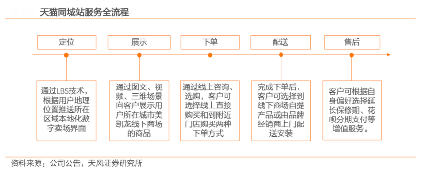經(jīng)典案例:根據(jù)公司公告、天風證券研究所等綜合資訊表明,用戶足不出戶即可咨詢或選購美凱龍商場中的家居產(chǎn)品,選中特定商品后,用戶可采用線上直接購買或到附近門店購買兩種購買方式;完成下單后,用戶可選擇于線下商場自提產(chǎn)品或由品牌經(jīng)銷商上門配送安裝。2019 年“天貓 同城站”上線后迅速發(fā)展,2020 年已覆蓋 22 個城市,開設(shè) 56 家實體店,上線品牌商戶 1.6 萬家。