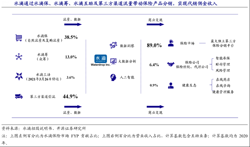 經(jīng)典案例:根據(jù)水滴招股說(shuō)明書(shū)、開(kāi)源證券研究所等綜合資訊表明,保險(xiǎn)分銷方面,水滴通過(guò)水滴保、水滴籌、水滴互助獲取自有流量,并逐年加大第三方外部流量導(dǎo)入,通過(guò)轉(zhuǎn)化流量實(shí)現(xiàn)保險(xiǎn)分銷。2020 年第三方渠道流量貢獻(xiàn) FYP 占比 44.9%。截至 2020 年末,水滴籌通過(guò)其特有 裂變式擴(kuò)散模式已獲取 3.4 億人捐款,累計(jì)覆蓋170 萬(wàn)病人,金額超 370 億元。