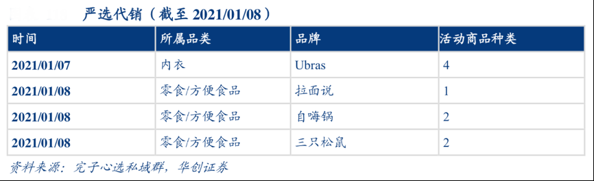 經典案例:根據完子心選私域群、華創證券等綜合資訊表明,完子之家私域發展“嚴選代銷”模式,逸仙電商通過自行選品(類似網易嚴選),在私域渠道內經銷非競爭品牌(異業合作),主要品類集中于零食/方便食品、女性內衣等。商 品售賣采用限時活動促銷的方式,在售賣日前 3 天左右開始預熱,且活動時間短至1天,“短時效性”+“頻繁推送優惠信息”刺激用戶下單購買。