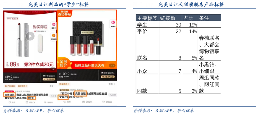 經典案例:根據天貓APP、華創證券等綜合資訊表明,國際大牌化妝品品牌的單價通常在150~400元之間,對美妝預算有限的學生黨和想要試錯的美妝小白來說門檻較高。完美日記將學生黨作為種子用戶:在天貓旗艦店等線上渠道,將“學生”納入其搜索關鍵詞/產品名稱,和其捆綁在一起,加深目標消費群體“學生友好”標簽印象。