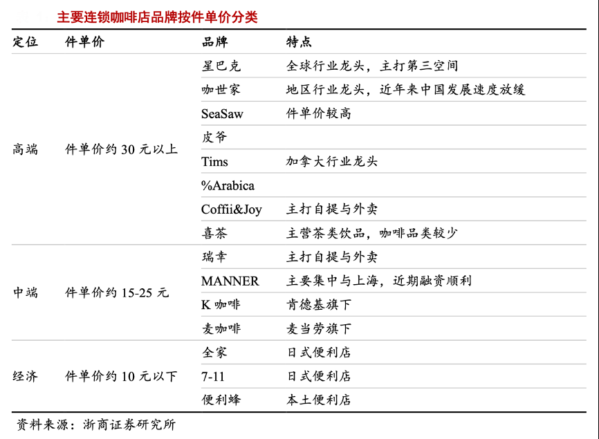 經典案例:根據浙商證券研究所等綜合資訊表明,按照件單價,可將中國連鎖咖啡店品牌分為三大類:高端品牌:30元以上,以星巴克、咖世家為代表;中端品牌:15-25元,以瑞幸、MANNER 為代表;經濟型品牌:以便利店售賣咖啡為代表。各品牌大多涉及“主流品類經營”。