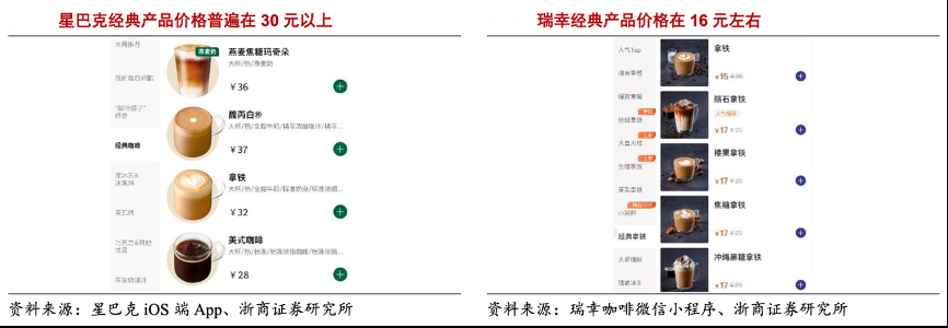 經典案例:根據星巴克ios端App、瑞幸咖啡微信小程序、浙商證券研究所等綜合資訊表明,星巴克件單價水平普遍在 30 元以上,而瑞幸在 16 元左右,且使用的原料(如咖啡豆、牛奶)未有明顯劣勢,口感并無大的差異。原因主要在于兩點:1)瑞幸的自取模式節省了租金成本。星巴克有大量顧客是外帶飲用的,卻依然承擔了租金成本; 2)瑞幸戰略性調低了產品的物料毛利率(物料毛利率即(產品收入-物料成本)/產品收 入)。根據各公司公告,瑞幸這一指標僅有 50%左右,而星巴克約為 70%左右(含部分物流成本,因此或更高)。